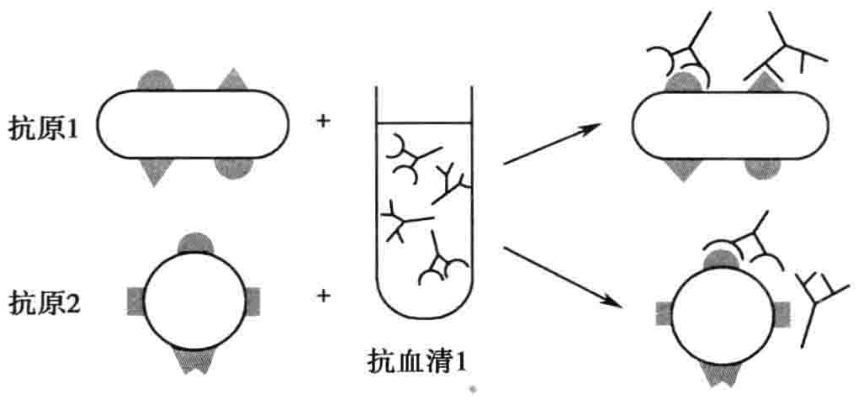 抗原(或抗体)除与其相应抗体(或抗原)发生特异性反应外,有时还可与其他抗体(或抗原)发生反应,称为交叉反应(图2-1)。交叉反应不仅在两种抗原决定簇构型完全相同时发生,也可在两种决定簇构型相似的情况下发生,只是后者的结合力相对较弱。血清学诊断中出现交叉反应时,易造成判断上的混乱,给免疫学诊断带来困难。但根据交叉反应的原理,利用容易得到的某种共同抗原(或抗体),在血清学诊断中检测体内相应的抗体(或抗原),在临床疾病的辅助诊断上有重要作用。