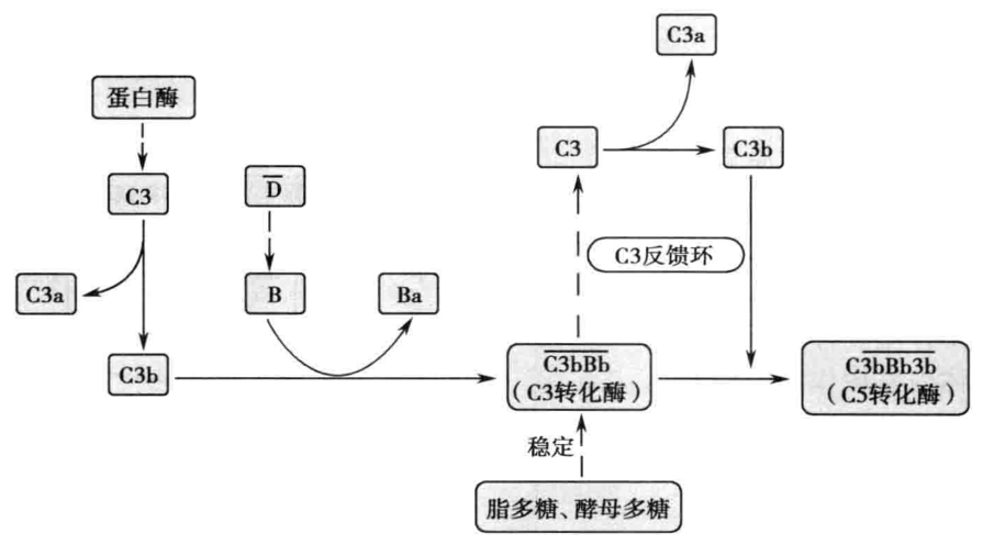 细菌脂多糖等胞壁成分为旁路途径C3转化酶提供接触表面使之稳定,后续反应得以进行。