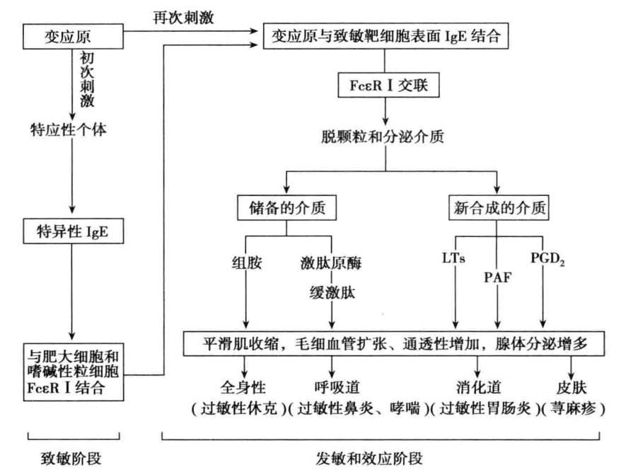 (二)发生机制 1. 致敏阶段 变应原经呼吸道、消化道或皮肤等途径进入机体,刺激 B 细胞产生 IgE 抗体。IgE 通过其 Fc 段与肥大细胞和嗜碱性粒细胞表面的 IgE Fc 受体结合,使机体对该变应原处于致敏状态。通常这种致敏状态可维持数月或更长时间,如长期不接触相同变应原,这种致敏状态可逐渐消失。